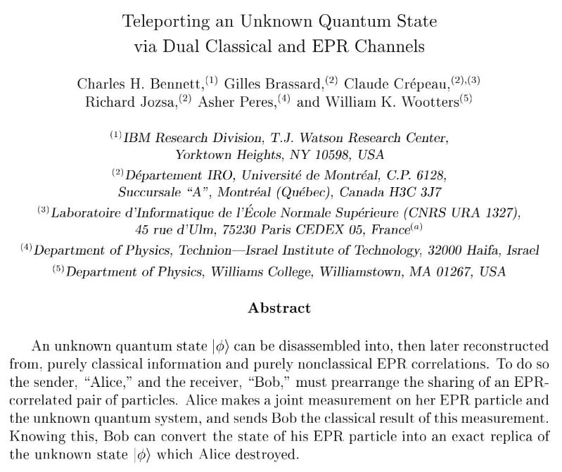 1993年3月,在美国西雅图的举行的物理学年会上,来自IBM的研究人员 Charles Bennett 的演讲让全世界的科幻迷们为之疯狂,因为他提出了著名的量子隐形传态理论。相关研究的论文在几日后便发表于《物理评论快报》: