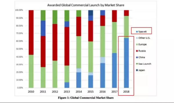 于是,他们不仅实现了今天在“猎鹰重型”上的成功,他们的“猎鹰9号”火箭更是成为了目前全世界成本最低廉,性能也最为稳定可靠的火箭,也因此成功占据了目前全世界火箭商业发射市场的绝对份额,几乎把原本占据市场主流的欧洲和俄罗斯全都挤了出去!