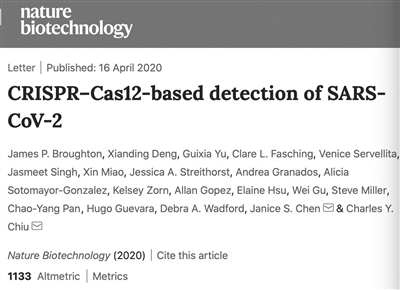 科技日报讯 (记者张梦然)英国《自然·生物技术》杂志16日公开的一项生物医学研究,美国科学家报告了一种基于CRISPR的诊断工具可以快速检测出新冠病毒。这一诊断工具大概需要45分钟就能给出结果,准确性与传统的RT-PCR检测相当。