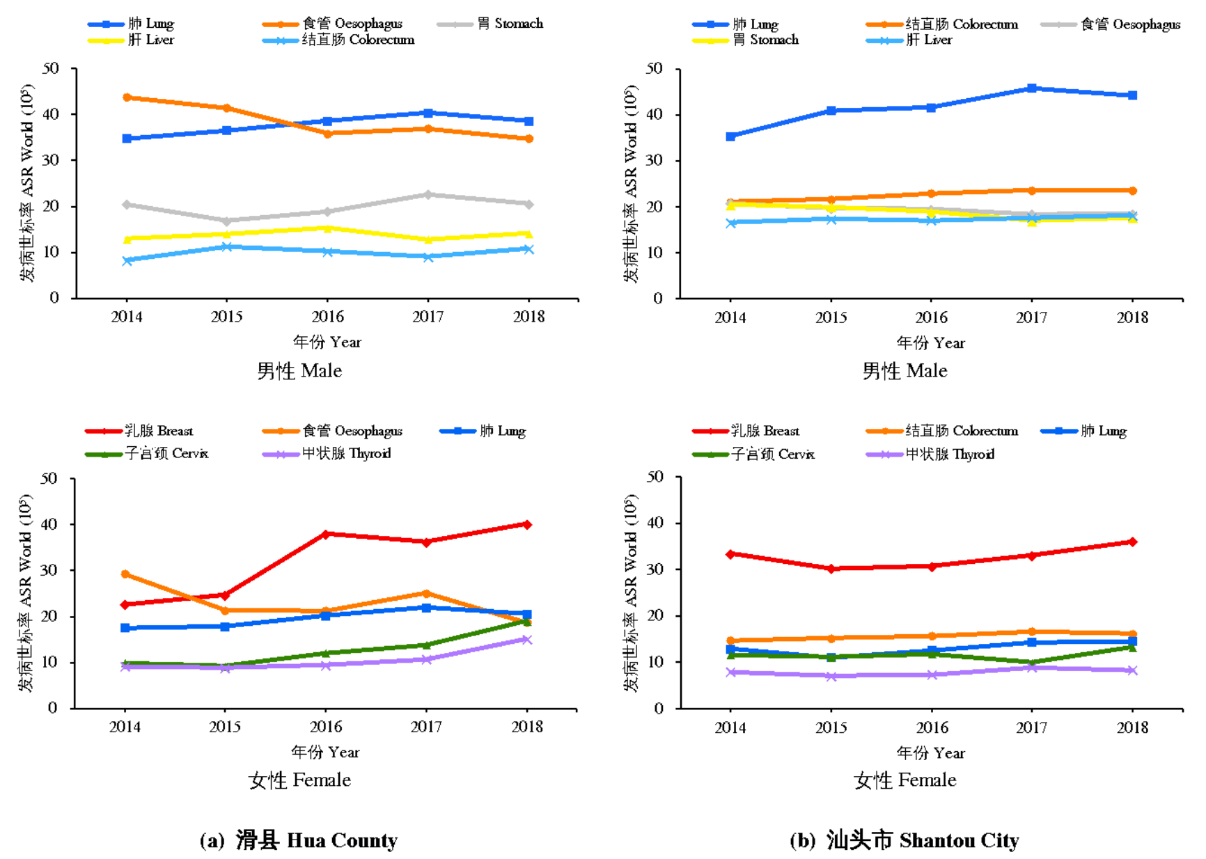 2014-2018年河南省滑县与广东省汕头市男、女性主要瘤种发病率变化趋势(MIS-CASS敏锐地捕捉到了滑县开展乳腺癌筛查引起的发病率“突增”)