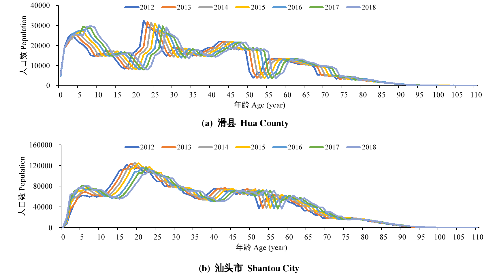 2012-2018年河南省滑县与广东省汕头市参保全人群的年龄分布(高参保率及稳定、详实的人口分布数据使MIS-CASS实现“全人群覆盖”)
