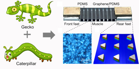 “我们的研究灵感来源于两种动物,即壁虎和尺蠖。”据薛龙建介绍,他的课题组长期致力于仿生材料研究,他们发现,壁虎脚掌上的独特刚毛结构可以使其在各种地形上进行稳定快速的运动,这正好可以解决目前小尺寸软体机器人对运动表面适应性较差的问题。因此,他们尝试向机器人上引入仿壁虎脚趾刚毛的足部,让机器人具有良好表面适应性。