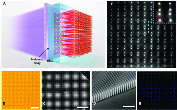 在此研究基础上,研究人员将超构透镜与非线性光学晶体(β相偏硼酸钡晶体,简称BBO晶体)组合在一起,构成全新的超构表面量子光源系统。他们设计并制备出10×10的超构透镜阵列,使用泵浦激光入射到该系统,超构透镜阵列将泵浦激光均匀的分成10×10份,并在BBO晶体中聚焦;聚焦的泵浦光在BBO中发生自发参量下转换过程,产生一系列信号/闲置光子对,理论上这一结构制备出的路径纠缠光子的维度为100,也能产生多光子。如果增加透镜阵列数,纠缠光子的维度还可以进一步提高。