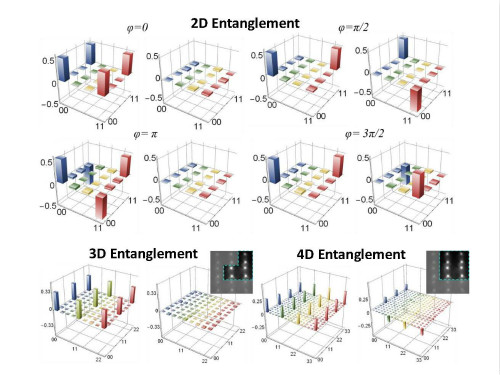 实验上,研究人员采用波长为404纳米的连续激光作为泵浦光,测量了由超构透镜阵列中不同的超构透镜产生的光子之间的纠缠特性。实验测得所构成的二维、三维以及四维路径纠缠态的保真度分别达到98.4%,96.6%和95.0%。不仅如此,超构透镜具有灵活的光场调控能力,可以对光场的相位、偏振、振幅等集成调控,从而进一步调制纠缠态。