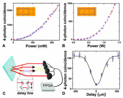 在该项工作中,研究团队通过对超构透镜的相位设计,对所制备的量子纠缠态进行了精细的相位编码,并通过实验进行了很好的证明。另外,该系统也可以用于制备简易紧凑的多光子源。实验中利用415纳米的飞秒激光作为泵浦源,分别测量了由该系统制备的4光子和6光子的符合曲线,并展示了4光子Hong-Ou-Mandel干涉的结果,得到很高的干涉对比度,证明产生的多光子量子光源具有很好的性质。