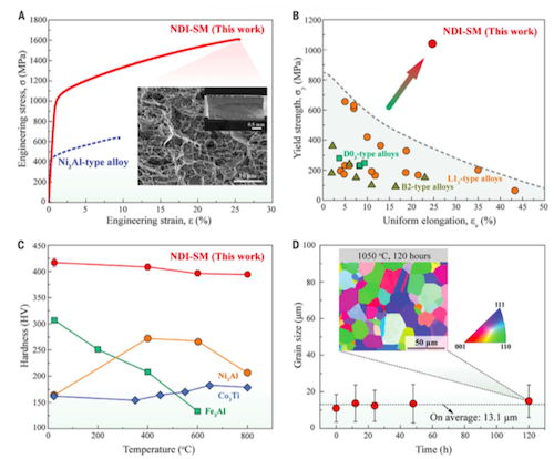 传统意义上的耐高温金属间化合物材料,如镍三铝(Ni3Al), 镍铝(NiAl), 铁铝(FeAl)等合金,往往存在着低屈服强度问题。而高屈服强度(比如1GPa及以上)条件下通常会造成材料的严重脆化,尤其是沿晶界的脆性断裂。另一方面,在高温条件下,大多数材料会发生晶粒的快速长大和粗化,造成合金强度显著下降,这进一步限制了它们在高温环境中的应用。