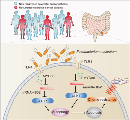 图. 术后化疗后复发的大肠癌病人肠黏膜中由于具核梭杆菌(Fusobacterium nucleatum)含量增加,激活自噬信号通路,导致化疗抵抗