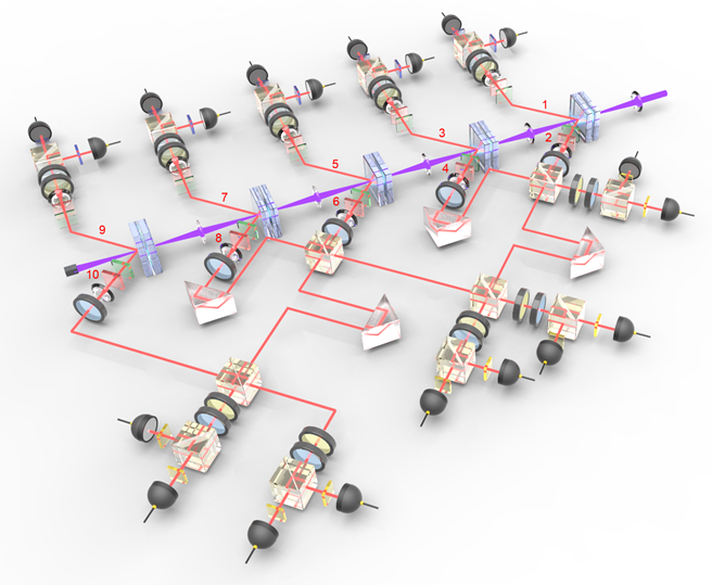 2012年,潘建伟院士研究团队首次实现了八光子纠缠,并成功将该技术应用于拓扑量子纠错和百公里量子隐形传态实验,相关成果入选Nature年度十大科技亮点。此后,对十光子纠缠的操纵成为量子信息领域的下一个重大目标。通过多年的探索,潘建伟院士研究团队利用两种不同的技术途径制备出了收集效率、保真度和光子全同性这三个综合性能国际最优的脉冲纠缠光子源,并在此基础上,实现了十光子纯纠缠和可提纯纠缠态的实验制备和严格验证,并且把多光子之间的纠缠特性应用于对相位的超分辨测量。