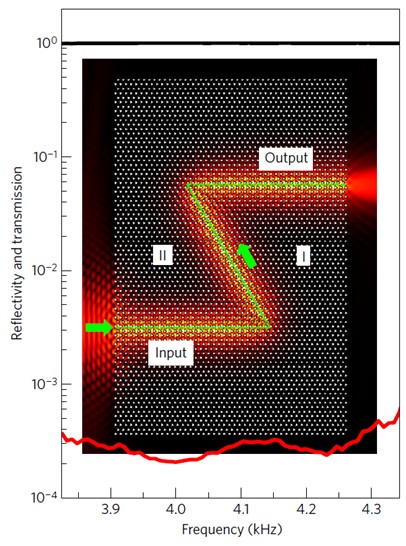 2016年2月,该团队的一项研究表明,一些声子晶体中存在一种“谷态”自由度,调节它可以实现新的声波操控方式。形象地讲,“谷态”声场就像是一个个声涡旋组成的阵列,调节声场的传播方向,人们可以控制涡旋的旋转取向。这项工作以“编辑推荐”的形式发表在Phys. Rev. Lett.上,并被Nature Physics作为亮点报道。