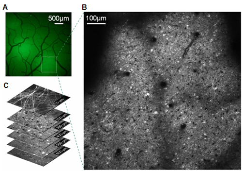 猕猴脑双光子成像图。A:视皮层V1的成像窗口;B:高质量的神经细胞图像;C:可实现不同层面/深度的成像。