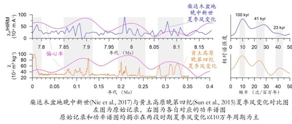 聂军胜教授团队及其合作者以一套连续沉积地层为研究对象,通过多方法相互印证,揭示出晚中新世8.5-7百万年期间柴达木盆地显著变湿,可能存在一个其古湖,其机制为青藏高原隆升引发的东亚夏季风降水带向西北移动。进一步研究发现,东亚季风降水在这段时期具有非常显著的10万年周期,其变化模式与第四纪晚期黄土高原记录的东亚季风降水模式类似(见图)。这项研究表明,气候以10万年为主导周期变化的现象在8百万年前就已经发生。这一研究成果将推动地学界对东亚季风轨道和构造尺度变化及驱动机制的认识。