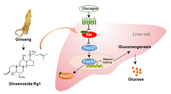 该研究发现人参皂苷Rg1通过调节Akt-FoxO1通路降低胰高血糖素介导的肝糖异生,为人参降糖作用研究阐明新机制,并为降糖药物的发现提供新的干预通路。