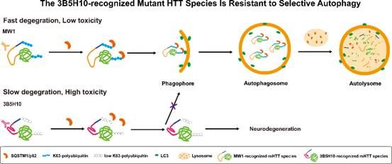 图. 由于对选择性自噬的抵抗性,具有过长的多聚谷氨酰胺序列(polyQ)的变异亨廷顿蛋白中被抗体3B5H10所识别的蛋白构象种类降解速度更慢,毒性更强