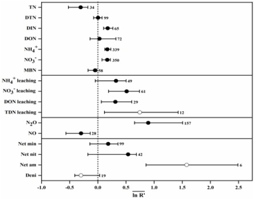 图2.冻融循环对7个氮库和10个氮排放的平均效应值