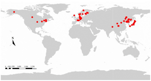 图1.整合分析中选择的冻融循环实验世界范围内分布