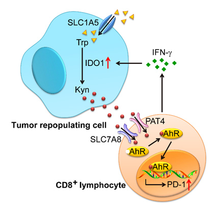 在国家自然科学基金项目(项目编号:81530080,81661128007, 81773062, 81788101)等资助下,中国医学科学院基础医学研究所黄波教授课题组揭示了具有干性的肿瘤再生细胞利用色氨酸代谢途径启动肿瘤组织中T细胞PD-1表达上调的机制。相关结果以“Tumor-Repopulating Cells Induce PD-1 Expression in CD8+ T Cells by Transferring Kynurenineand AhR Activation”(肿瘤再生细胞通过犬尿氨酸转移以及芳香烃受体激活诱导CD8+ T细胞表达PD-1)为题,于2018年3月12日在Cancer Cell(《癌症·细胞》)上在线发表。黄波为文章的通讯作者,中国医学科学院基础医学研究所、临床免疫中心刘玉英副研究员及中国医学科学院基础医学研究所博士研究生梁晓雨和董文茜为共同第一作者。论文链接:http://www.cell.com/cancer-cell/fulltext/S1535-6108(18)30058-8。