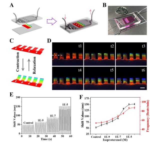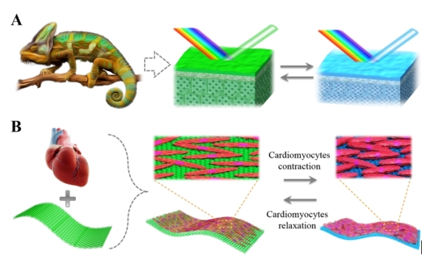 “器官芯片”是要在微流控芯片上仿生构建微器官来替代生物体,进行药物评估和生物学研究等。作为构建未来新药评价体系的重要发展趋势,器官芯片对于支撑我国创新药物研发以及转化医学的发展具有重大战略意义。心脏是人体最重要的器官,因此,构建具有心肌细胞传感功能的“心脏芯片”是“器官芯片”开发的重要内容。东南大学赵远锦教授课题组受变色龙细胞调控结构色的启发,在国际上率先提出了构建具有结构色传感功能的“心脏芯片”的设想。研究人员利用表面具有微槽的反蛋白石结构水凝胶弹性薄膜进行心肌细胞培养,实现了细胞的诱导取向组装,在凝胶体系中较好的促进心肌细胞恢复自主跳动能力。由于心肌细胞的搏动过程伴随着细胞的伸长和收缩,因此基底上的反蛋白石结构水凝胶弹性薄膜将经历相同的体积或形态变化,表现为其自身同步变化的光子禁带和结构色。这种“活体”结构色水凝胶材料为构建具有自反馈功能的动态机器人等智能器件奠定了基础。特别是将“活体”结构色水凝胶材料集成到微流控芯片中,一个前所未有的具有微生理可视化功能的“心脏芯片”得以开发。该技术在心肌相关的新药评价和疾病研究中具有独特优势,与常规的临床试验相比更经济、更快速而且无创伤性,既是临床和理论基础之间一种有机的融合,也是多学科交叉的高度体现,代表着我国创新药物研发关键技术平台的重大突破。