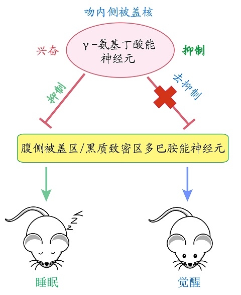 吻内侧被盖核(RMTg)GABA能神经元兴奋时抑制下游多巴胺能神经元,促进睡眠;RMTg抑制时,通过解除对下游多巴胺能神经元的抑制,增加多巴胺活性,促进觉醒。