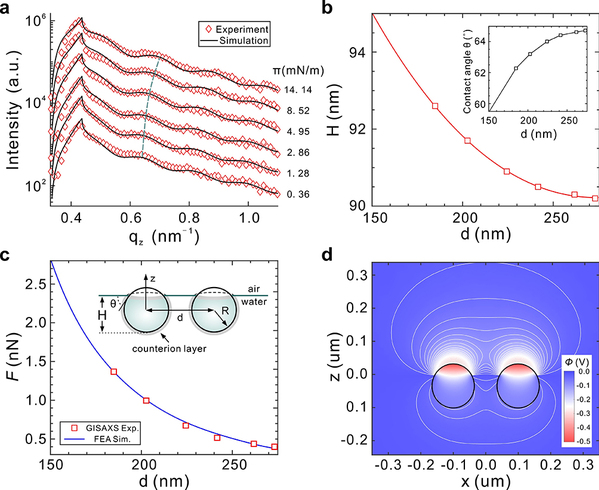 在这项研究中,陈刚课题组首次将同步辐射X射线表面掠入射小角散射技术应用于胶体粒子在气液界面处的自组装研究(如图1所示)。这一方法不但可以原位地跟踪观测胶体粒子在界面内的结构演变过程,同时可以跟踪测量其相对于界面的位置和结构的变化。通过这一研究,研究人员观测到胶体粒子在气液界面处从无序的分散状态,经过多个亚稳态,最后形成稳定的二维六角密排的超晶格结构的过程。在这一过程中,他们意外发现,随着胶体粒子之间相互靠近,它们在液体中的浸润深度(或接触角)发生了变化。这一突破性的发现是之前的研究没有也无法实现的。由于胶体粒子浸润深度的变化,使其周围液面发生形变形成凹面,当相邻粒子之间的凹面相互重叠时会产生毛细力,而这一由液面弯曲形成的毛细力正是导致带相同电荷的胶体粒子之间长程相互吸引的真正原因。为了进一步分析胶体粒子之间的相互作用势,研究人员进行了完整的有限元分析与模拟。至此,一个曾经困扰全世界科学家们将近四十年的谜题得以破解。