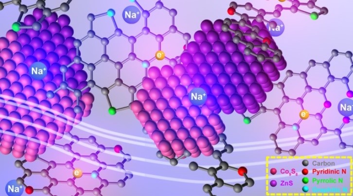 我校十佳博士研究生方国赵和周江特聘教授,在团队前期工作基础上,利用双金属MOFs为模板,成功开发出一种用于钠离子电池负极的氮掺杂碳包覆双金属硫化物,有效解决了目前钠离子电池负极材料在充放电过程中离子扩散缓慢、材料体积膨胀等瓶颈问题。研发的双金属硫化物与磷酸钒钠匹配成全电池能运行500圈,容量保持率高达93%,在钠离子电池负极方面取得了重要突破。研究成果近日发表在国际能源顶级期刊《先进能源材料》(Adv. Energy Mater., 2018, DOI: 10.1002/aenm.201703155)(IF=16.72)。材料学院周江特聘教授、潘安强教授、梁叔全教授为论文共同通讯作者,我校为唯一通讯完成单位。