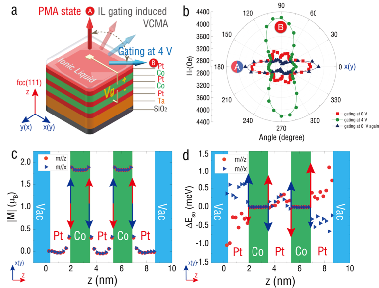 近日,西安交通大学电信学院“青年千人”刘明教授课题组研究了基于电场调控的垂直磁各向异性结构。通过给Au/[DEME]+[TFSI]−/Pt/(Co/Pt)2/Ta施加4V的门电压,在室温下实现了高达1572 Oe的各项异性场调控,对应着高达378 Oe/V的磁电耦合系数。通过铁磁共振表征和磁畴衍化的观察,确认了该调控过程中磁矩稳定且可逆的面内面外翻转行为。第一性原理计算表明,固液界面双电层电场在金属叠层界面处引入的非对称面内Rashba场实现了自旋取向的面外向面内翻转。该工作对于磁电存储设备和其他磁电耦合器件的设计与研发具有重要的意义。