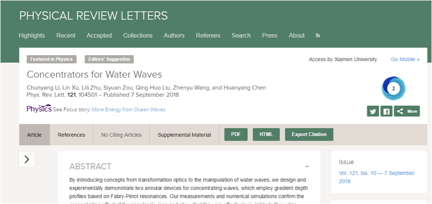 近日,电子科学与技术学院陈焕阳教授课题组联合浙江大学王振宇课题组在水波能量收集研究方面取得重要突破,相关成果以“Concentrators for Water Waves”为题在线发表在《物理评论快报》杂志(PHYSICAL REVIEW LETTERS, 2018, 121,104501)。物理评论快报作为世界一流的物理期刊,自1958年出刊以来刊登过众多诺贝尔奖获得者和杰出科学家的开创性研究成果,所刊论文涵盖基础、应用和跨学科物理研究的所有主题,极具影响力和创新性,现已涵盖130多个国家的重要研究内容,2017年度影响因子为8.839。