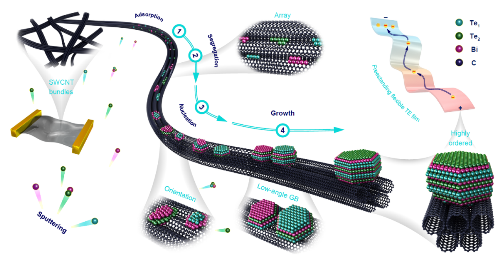 相关研究成果(“Flexible layer-structured Bi2Te3 thermoelectric ona carbon nanotube scaffold”)于11月19日在《Nature Materials》在线发表。该工作获得了国家重点研发计划、国家自然科学基金、中国科学院装备研制项目、中科院百人计划等项目的支持和金属所公共技术服务部谭军研究员的大力协助。