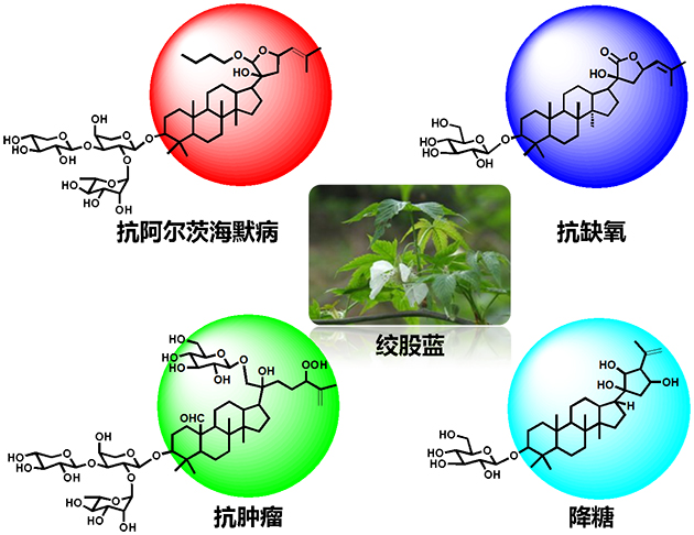 中国科学院西北特色植物资源化学重点实验室杨军丽团队,利用现代分离技术、结构鉴定技术和药物筛选技术,从绞股蓝中首次发现19(10→1)abeo达玛烷型三萜类降糖活性化合物(Phytochemistry 2018, 155:171)。同时,还从中分离鉴定了新结构的抗肿瘤活性化合物(J. Agric. Food Chem. 2017, 65:5926)和抗阿尔茨海默病活性化合物(Phytochemistry Lett. 2019, 31:147)。