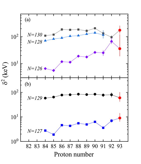 此前,通过对原子核α衰变规律的研究,有研究者在实验中证实,在U同位素核(质子数Z = 92)中存在N = 126壳效应减弱的现象。然而,有关N = 126壳效应在Z > 92的核素中是否依然存在的研究还非常有限。