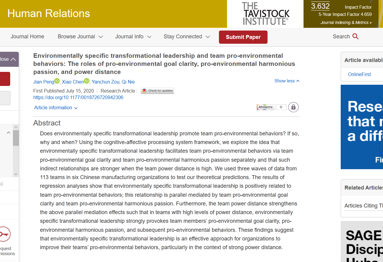 近日,我院彭坚副教授(第一作者)、邹艳春教授(通讯作者)与合作者的研究成果“Environmentally specific transformational leadership and team pro-environmental behaviors: The roles of pro-environmental goal clarity, pro-environmental harmonious passion, and power distance”(环境导向变革型领导与团队亲环境行为:亲环境目标清晰度、亲环境和谐激情与权力距离的作用)被国际知名期刊《Human Relations》接受并在线发布(Online First)。该论文的合作者包括:广东外语外贸大学的陈晓讲师与南京航空航天大学的聂琦博士。《Human Relations》是英国金融时报认定的50本经管类重要期刊之一(The Financial Times Top 50 journals list),在澳大利亚商学会期刊质量清单中位列A*(Australian Business Deans Council Journal Quality List),在英国的商学院协会期刊指南中评定为4星等级(CABS Academic Journal Guide)。