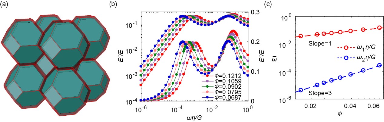 图2: 三维多晶的内耗峰尺寸效应:(a) Wigner-Seitz 模型; (b) 不同晶界体积分数 Φ 下的多晶体的损耗模量频率谱:这里高频峰对应于图1(c) 中的“葛式峰”,由晶界的粘滞性滑动引起,而低频峰则是新发现的耗散峰,由晶界的法向弛豫引起; (c) 两个峰对应的临界频率值与晶界体积分数 Φ 的关系,注意晶界体积分数 Φ 与晶粒寸尺 d 成反比,因此低频峰临界频率正比于 d ^-3,高频峰临界频率正比于 d ^-1.
