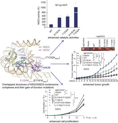 NSD2和NSD3结合核小体的冷冻电镜结构。其中一些致癌突变会增加NSD3的催化活性,增加癌细胞的增殖,并增加裸鼠移植瘤的生长速率。