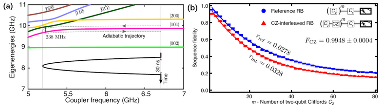 Fig. (a) 系统能级示意图随可调耦合器频率的变化关系。(b) 随机基准校验标定两比特量子门保真度接近0.995.