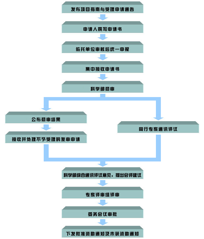 国家自然科学基金的项目评审严格实行“依靠专家,发扬民主,择优支持,公正合理”的评审原则,采用同行专家通讯评审和会议评审两级评审制度。例如集中审批的项目申请受理和评审的流程如下: