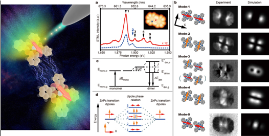 中国科学技术大学单分子科学团队长期致力于发展将扫描隧道显微镜(STM)高分辨静态表征和光学技术高灵敏动态探测相结合的联用系统,特别是通过巧妙调控隧道结纳腔等离激元的宽频、局域与增强特性,极大地丰富了测量和调控手段,并拓展了测量极限,为单分子物理化学研究提供了新的机会。纳腔等离激元调控和STM操纵技术的精妙结合,是实现分子间相干偶极耦合的实空间直接观察的关键。通过人工构筑锌酞青染料分子的二聚体结构,他们对不同激子能态的偶极耦合模式分别进行了亚纳米空间分辨的电致荧光成像。他们发现,局域电子的激发能量迅速被整个分子二聚体所共有,构成了一个单激子量子纠缠体系,而且不同的偶极耦合能态的光子成像图案具有类似σ或π成键反键轨道的空间分布特征。这些空间特征不仅反映了分子二聚体的局域光学响应特性,而且还直观地揭示了分子二聚体中各个单体跃迁偶极之间的相干耦合方向和相位信息。