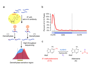 m1A-ID-seq测序新技术绘制人全转录组m1A RNA修饰谱图。(a)m1A-ID-seq流程图;(b)m1A化学修饰的分布呈现5’UTR特异性;(c)ALKBH3是mRNA上m1A的去甲基化酶。