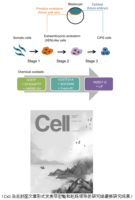 12月17日,Cell杂志以封面文章的形式报道了北京大学邓宏魁和赵扬研究团队的最新研究成果 “A XEN-like State Bridges Somatic Cells to Pluripotency during Chemical Reprogramming”(一个类似胚外内胚层(XEN)的状态介导了化学重编程过程中体细胞向多潜能干细胞的转变)。该研究发现化学重编程过程中的一个类似于胚外内胚层细胞的中间态,并据此大幅提升了化学诱导的多潜能干细胞(CiPS细胞)的诱导效率。该研究得到了国家自然科学基金重大研究计划(91319305),创新研究群体科学基金(31521004),干细胞研究国家重大科学研究计划(2012CB966401)的资助。论文连接: http://authors.elsevier.com/a/1SDam_278yxQOv