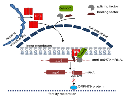 红莲型细胞质雄性不育系是当前三种主要类型水稻细胞质雄性不育系之一,为杂交育种作出了巨大贡献。红莲型杂交水稻育性受orfH79不育基因控制,为两对独立恢复基因RF5和RF6恢复正常。RF6被定位于第8号染色体,能同时恢复红莲型和包台型。RF6属于PPR基因P亚家族里一个十分特殊的新基因,由20个PPR单元串联而成,其中PPR单元3-5被复制了一次,进而具备恢复功能;而其等位基因rf6共有17个PPR结构单元,对应的PPR单元3-5未被复制,不具备恢复功能,暗示着PPR单元对基因的生物学功能具有重要的意义。RF6蛋白定位在线粒体,在那里它与己糖激酶6(hexokinase 6,OsHXK6)物理结合,加工不育基因转录本atp6-orfH79,确保了正常花粉发育及恢复育性,而下调OsHXK6表达水平可导致atp6-orfH79转录物累积和雄性不育。PPR是植物体内一个庞大的基因家族,RF6的鉴定为研究PPR基因家族开辟了新方向;对OsHXK6的研究为调控线粒体RNA的代谢添加了新知识,这些结果对于进一步利用作物杂种优势具有重要的理论与实践意义。