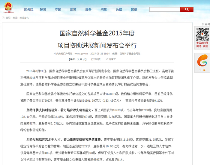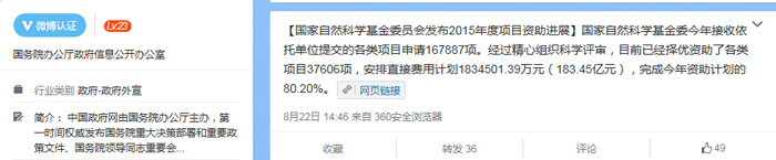 8月21日,我委召开新闻发布会对外发布国家自然科学基金2015年度项目资助进展。8月22日,国务院办公厅主办的中国政府网微博和中国政府网报道了本次新闻发布会。