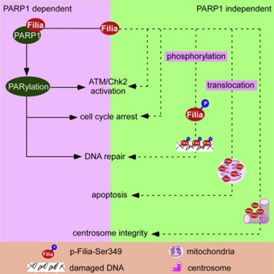 针对这一领域的研究热点和难点,郑萍课题组以小鼠胚胎干细胞为例,发现了胚胎干细胞维持遗传物质稳定性的关键调控因子Filia。Filia特异表达于胚胎干细胞中,功能缺失后干细胞迅速发生变异,并产生致瘤性。DNA损伤反应 (DNA damage response, DDR) 是细胞维持遗传物质稳定性的保守机制。Filia可调控DDR的信号传导、细胞周期检测、DNA损伤修复、损伤细胞的分化和凋亡过程。进一步研究表明,Filia一方面与DDR的另一个多能调控因子PARP1相互作用,促进PARP1的酶活性,从而激发强大的信号传导、细胞周期检测和DNA损伤修复功能。另一方面,Filia又通过不依赖于PARP1的途径发挥作用。Filia位于中心体上,并可在DNA损伤时转移到DNA双链断裂位点参与损伤修复。凋亡发生时,Filia又可迁移到线粒体参与凋亡调控。该研究首次从多个角度揭示Filia对于多能干细胞维持遗传物质稳定性的重要意义,并为评价多能干细胞遗传物质稳定性提供了简单有效的分子标记。