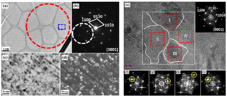 研究人员发现,采用传统的固相反应法,在Cu2S1-xTex固溶体中,利用S和Te两种阴离子原子质量和原子半径的巨大失配,可以在块体热电材料中实现马赛克晶体微观结构。基于前期在Cu2X(X=S, Se, Te)(Adv.Mater. 2014, 26, 3974;Adv. Mater. 2013, 25, 6607; Nat. Mater. 2012, 11, 422)的研究基础,研究人员得到了非常反常的完全固溶体化合物Cu2(S, Te)。不同于Cu2S和Cu2Te室温下异常复杂的晶体结构,Cu2(S, Te)固溶化合物室温为单相材料,具有高对称性的六方晶体结构(P63/mmc),与基体Cu2S中温结构相同(-Cu2S)。SEM结合EBSD观察揭示该固溶样品为晶粒尺寸分布范围宽(90 nm~6 m),且晶粒取向任意的多晶材料,微米(SEM)及纳米(TEM)尺度的元素面扫描分析显示其各组成元素分布均一,无第二相存在。固溶样品的超薄切片及粉末的TEM观察均揭示该固溶化合物单个晶粒内部的微观结构呈现特殊的马赛克晶体特征:单个晶粒内部是由大小为10-20 nm尺寸的亚晶粒组成(见图2(c)(d)),这些亚晶取向近乎一致,表现为具有相同的衍射花样(见图2(e)),而亚晶粒间存在极其微小角度的偏转,表现为相同的衍射花样中不同衍射斑点的亮度存在差异(见图2(f-i))。经历973 K高温后,马赛克晶体结构的特征依然保留。通过成分调控实现高温电和热输运参数最优化组合,300 K-1000 K电导率在104Ω-1 m-1量级,塞贝克系数在60 μVK-1至260 μVK-1区间;总热导率在整个测量温区低至0.8 W m-1 K-1以下,比其他材料体系表现出明显的竞争力。另外,对高温电输运基于电声散射和单抛物带近似的拟合分析显示,该固溶样品的塞贝克系数相对基体材料具有明显的提升,可能与其特殊的马赛克晶体结构中存在大量纳米尺度的界面导致的量子效应或者能量过滤效应有关。对该固溶样品低温热输运的测量中亦发现了十分有趣的现象,此材料虽为多晶材料,但其低温热传导的行为却呈现出非晶玻璃的热传输特性,即其晶格热导率随温度的变化关系曲线中在10-50K附近的低温区并未见到晶体材料中的特征峰出现,且其晶格热导率值极低,2 K-300 K的低温区间,晶格热导率均低于0.5 W m-1 K-1,甚至比非晶玻璃的热导率还要低。这可能来自微观结构中数目众多的纳米界面对热传输声子平均自由程的限域作用,类似于非晶玻璃中晶格长程无序的效果。
