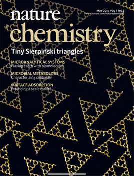 该论文同时被选为Nature Chemistry当期封面文章(下图)。Nature Chemistry杂志还专门配发了美国Indiana大学化学系Steven L. Tait教授撰写的题为“Surface chemistry: Self-assembling Sierpiński triangles”的评论文章(Nature Chemistry,2015,7,370–371):http://www.nature.com.libproxy1.nus.edu.sg/nchem/journal/v7/n5/pdf/nchem.2238.pdf。
