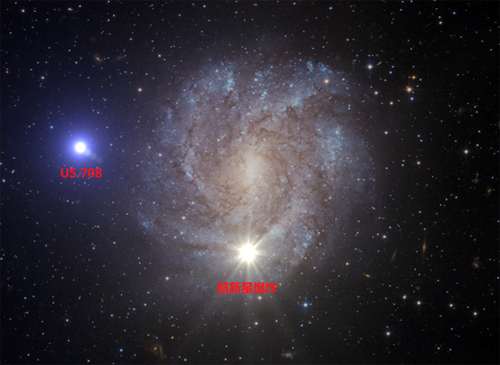 银河系最高速度的恒星US 708(如图)。US 708起源于银盘上的一次Ia型超新星爆炸,在超新星爆炸后,它的残留伴星获得了一个很高速度,然后逃逸到目前的位置。图片来源: ESA/Hubble, NASA and S. Geier