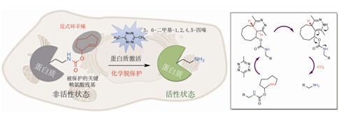 北京大学化学与分子工程学院陈鹏课题组长期致力于发展活细胞内的外源化学反应,特别是生物正交消除反应的提出,丰富了生物正交反应的内容(Nat. Chem. 2014, 6, 352-61; Nat. Commun. 2014, 5, 4981;J. Am. Chem. Soc. 2013, 135, 7330-8; Chem. Soc. Rev. 2014, 43, 6511-26.)。最近,他们首次在活细胞的蛋白质上实现了“(逆)狄-阿”反应,并将其应用于蛋白质酶的激活(Nat. Chem. Biol. 2014, 10, 1003-1005.)。基于对“(逆)狄-阿”反应的解析,他们发现,对于烯丙位被氧原子取代的反式环辛烯,在与3,6-二甲基-1,2,4,5-四嗪发生反应后会进一步发生重排,诱导环辛烯骨架与氧原子之间C-O键的断裂,从而发生脱除反应。这种特殊的“(逆)狄-阿”反应类型首先在有机小分子上和模型蛋白质上得到了很好的验证。实验表明,该反应能够很好地与生物体系兼容,对于插入活细胞内蛋白质上的反式环辛烯保护的赖氨酸,能在十分钟内将其高效转化为天然赖氨酸。在以上结果的基础上,他们将“(逆)狄-阿”反应应用于小分子介导的蛋白质激活。首先,他们在萤火虫荧光素酶的活性位点引入环辛烯保护的赖氨酸,抑制其催化活性。通过四嗪介导的“(逆)狄-阿”反应,释放出被保护的催化赖氨酸残基,实现荧光素酶的特异激活。与此同时,利用该酶活性定量可测的特点,他们将反应产率与生物发光的信号强度关联起来,高效定量地监测了这一活体内的蛋白质脱保护反应。数据表明,该反应能够在15分钟内激活90%以上处于抑制状态的蛋白质酶。这一研究突破将针对“蛋白质激活的理性设计”从概念验证提升到了拓展应用阶段,具有重要的意义。
