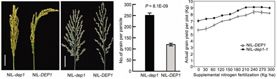 中国科学院遗传与发育生物学研究所傅向东课题组通过与同行合作,成功克隆了一个中国超级稻增产关键基因—DEP1(Dense and Erect Panicles 1),该基因编码植物特有一种G-蛋白γ亚基。突变的DEP1基因能够提高水稻茎尖分生组织的活力,促进细胞分裂,增加穗粒数,进而极为显著地提高水稻产量(Nat. Genet.2009, 41, 494)。课题组进一步研究发现,DEP1还能够降低水稻营养生长期对氮的响应,增强氮的吸收和同化能力,进而提高收获指数和产量。G蛋白是调控动植物生长发育的重要信号传导蛋白,包括α、β和γ亚基。在体内,DEP1蛋白能够与Gα亚基和Gβ亚基相互作用。Gα活性降低或Gβ活性提高均能抑制水稻生长的氮响应。因此,通过调节G蛋白的活性可以改变水稻的氮响应,进而在适当减少氮肥施用量的条件下获得水稻的高产(Nat. Genet.2014, 46, 652)。上述研究有效加深了人们对水稻穗发育和产量形成的分子基础以及G蛋白功能的理解,为研究水稻产量控制、实现水稻生产可持续发展提供了重要基因资源和新策略。