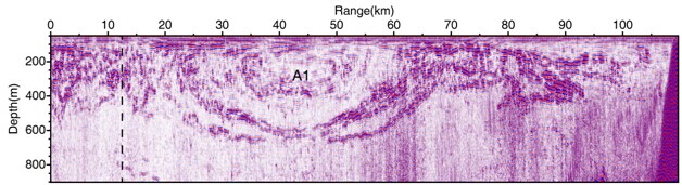 研究小组利用两条位于阿拉斯加湾的反射地震资料,获得了阿拉斯加湾Yakutat海表涡旋的精细结构图像,清晰展示了涡旋内部细结构及其与周边水团的接触关系,发现涡旋底部层状结构与旋臂,坡折带强流锋面等现象,结合卫星资料和现场水文观测资料,首次综合描述了涡旋的路径、尺寸、形状、水团接触关系、运移方向等属性特征。