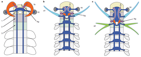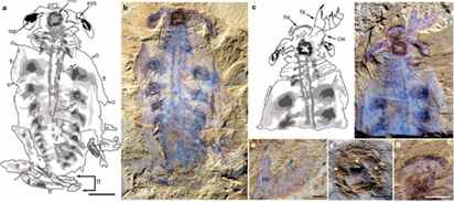 图-4奇虾大爪肢(橙色)及其神经节(紫色)演化示意图;a 奇虾;b 推测的中间演化类型;c 现生甲壳动物