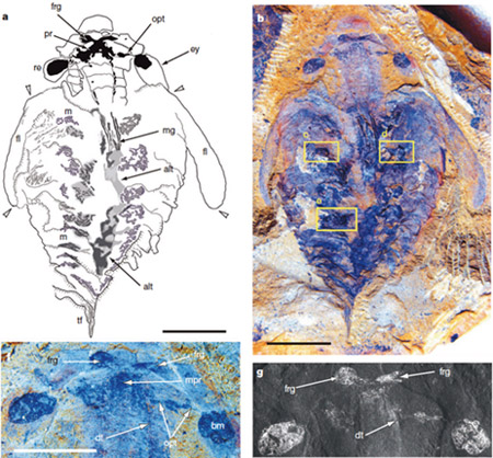 图-2 保存有头部脑神经结构的奇虾Lyrarapaxunquispinus