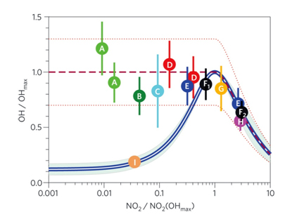 在这一研究中,研究团队从OH自由基与j(O1D)存在高相关性这一特殊观测现象出发,在OH-NO2光化学坐标系中对北半球九个不同森林和超大城市地区的OH自由基观测结果进行了归一化闭合分析。研究表明,除美国黄松林地区外,其它所有地区的OH自由基观测结果均可以被同一模型所描述。此模型与传统光化学理论显著不同:新构建的模型在低NOx区间预测的OH自由基浓度(图中紫色虚线)远高于传统光化学理论预测结果(图中蓝色双实线)。