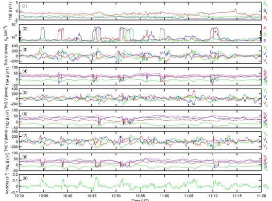 图1. THEMIS卫星所观测到的行星际磁场(月球轨道附近的向阳面太阳风中),地球磁层昏侧低纬边界层的涡旋结构速度场和磁场,以及基于三点观测数据计算的速度涡旋。